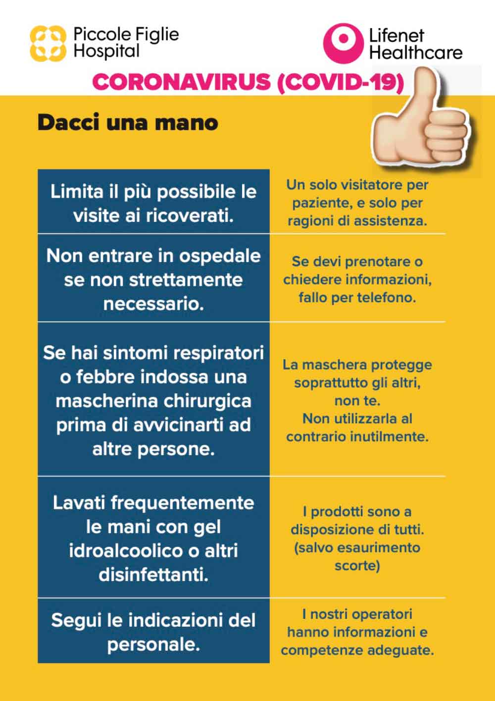 - Chi accedesse all’ospedale, per una visita ambulatoriale indifferibile, avendo uno stato febbrile o sintomi respiratori è invitato ad indossare una mascherina al viso, per proteggere le altre persone con cui viene a contatto. Qualora ne fosse sprovvisto può rivolgersi al personale di PFH per richiederla.